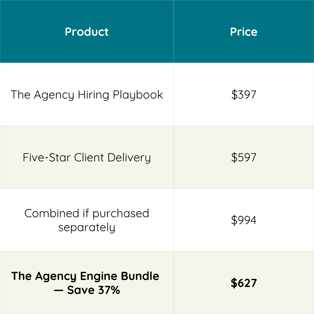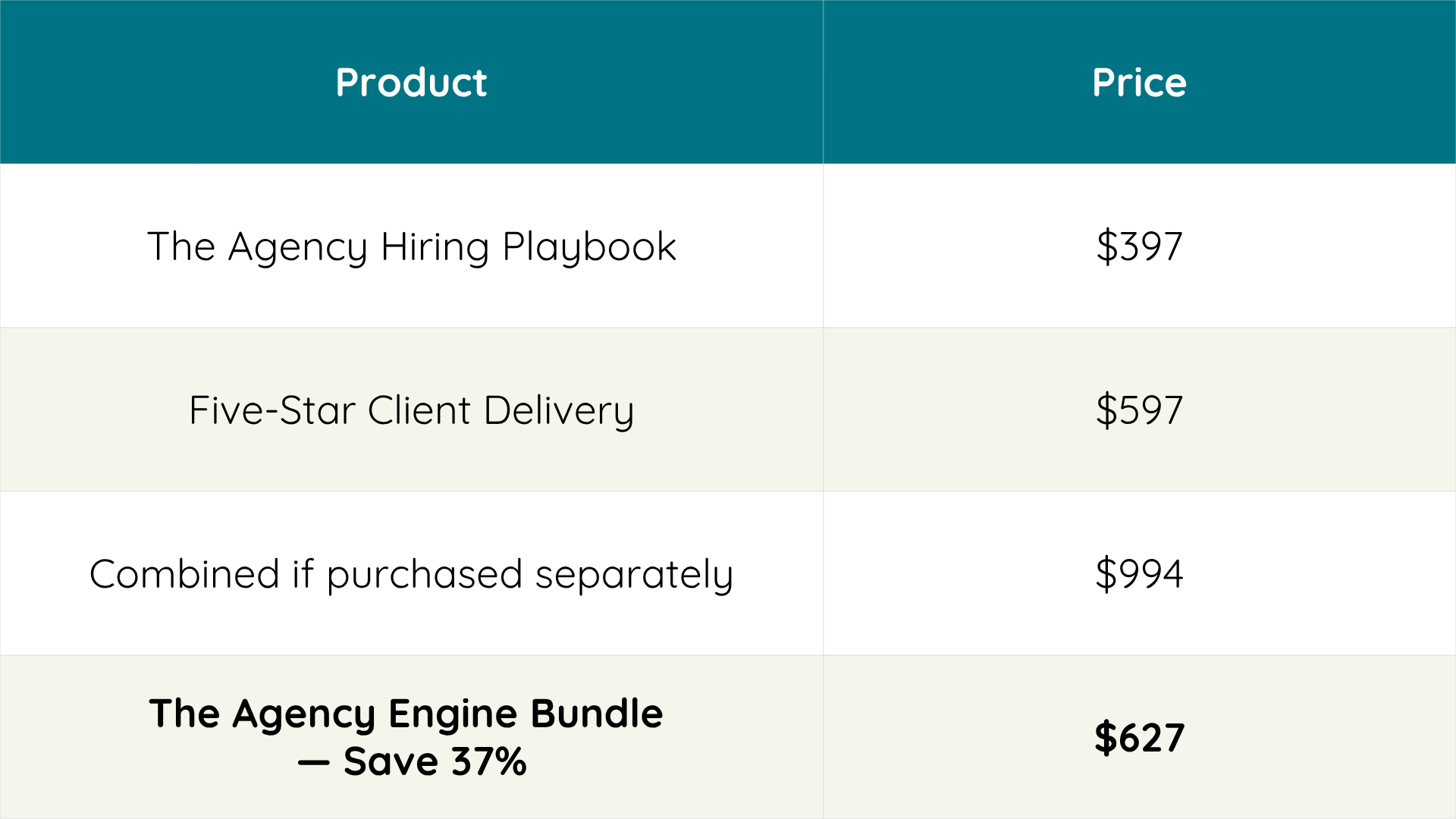 YES, I WANT THE AGENCY ENGINE — $627The Agency Hiring Playbook + Five-Star Client Delivery · Save $367